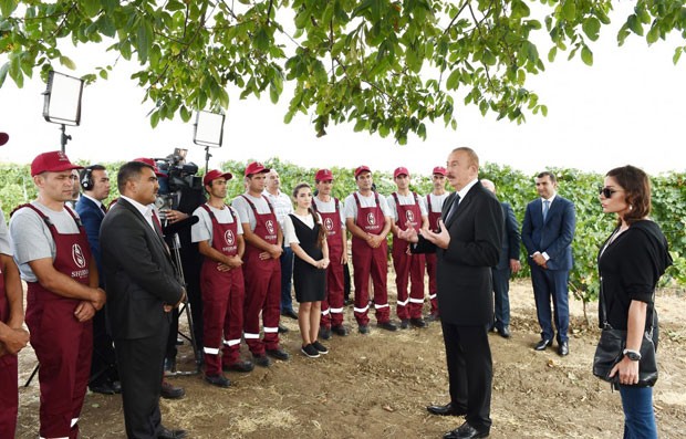 Üzümçülük əmək tutumlu kənd təsərrüfatı sahəsidir. Mənə verilən məlumata görə, burada 300 hektarda salınmış üzüm bağlarında 200-ə yaxın insan işlə təmin olunub. Bu kəndin sakinləridir. Mənə verilən məlumata görə, bu kənddə işsizliklə də bağlı problemlər aradan götürülüb. Bizim əsas məqsədimiz də odur ki, iş yerləri yaradılsın, insanlara yaxşı maaş verilsin. Hər bir vətəndaş halal zəhməti ilə öz həyatını qursun, ailəsini saxlasın və firavan yaşasın.