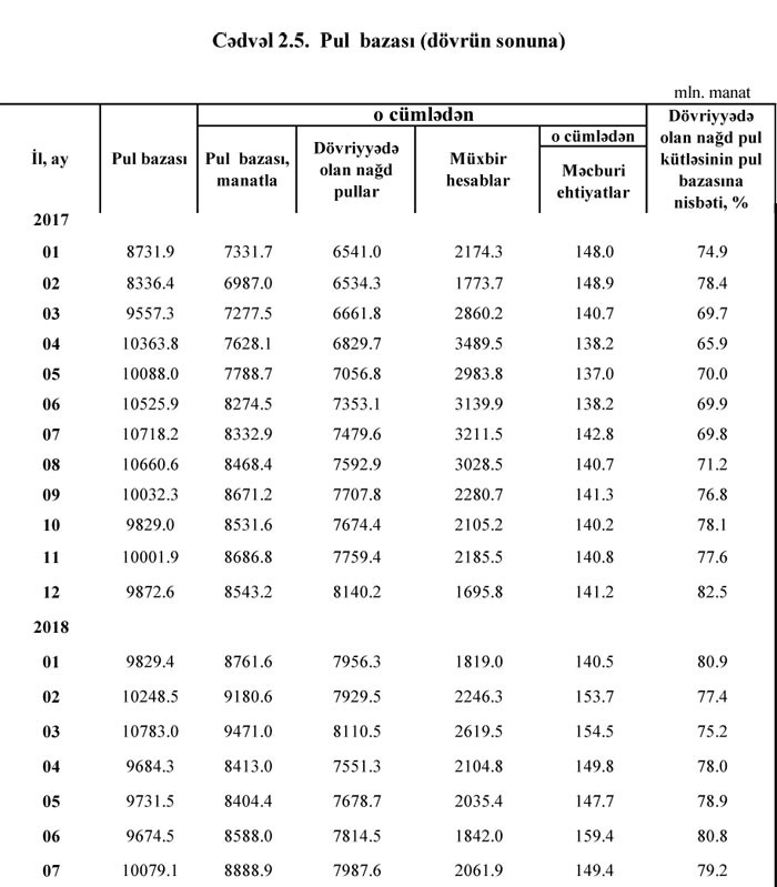 2018-ci ilin İyul ayının sonuna pul bazası 10 milyard 79.1 milyon manat olub. İyun ayı ilə müqayisədə pul bazası 405 milyon manat və ya 4,2% artıb. Ötən ilin eyni İyul ayı ilə müqayisədə isə artım 639 milyon manat və ya 6% təşkil edib.