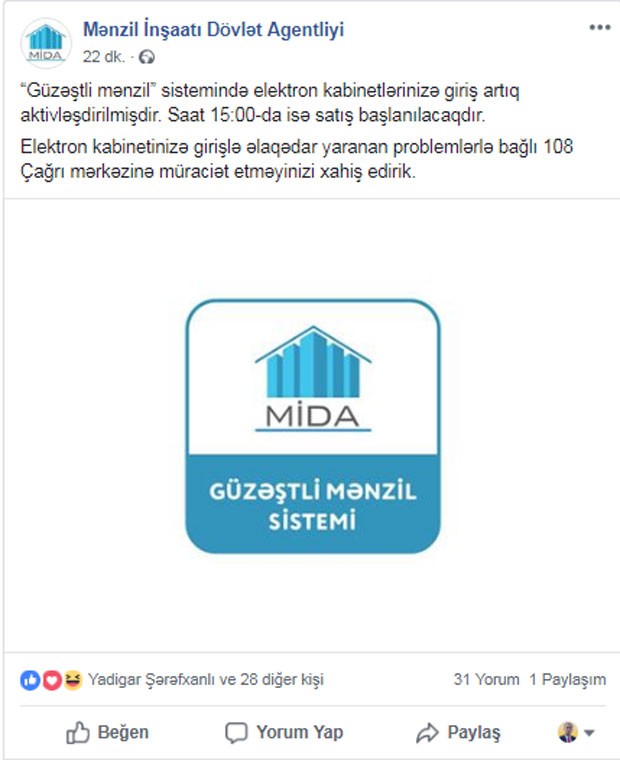 "Güzəştli mənzil” sistemində elektron kabinetlərinizə giriş artıq aktivləşdirilib".