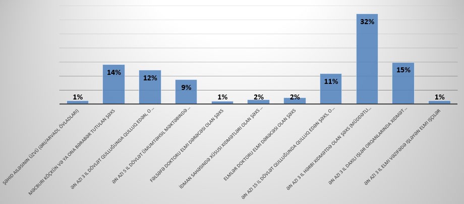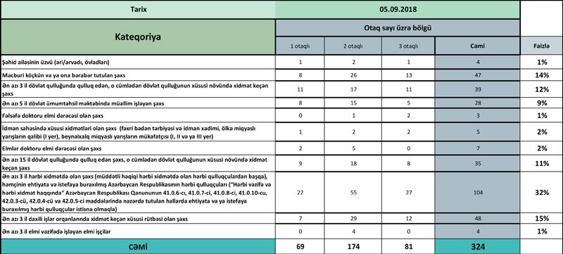 “Marja” Azərbaycan Respublikasının Mənzil İnşaatı Dövlət Agentliyinin açıqladığı statistik məlumatlara istinadən xəbər verir ki, ən çox mənzili hərbiçilər seçib. Belə ki, satışa çıxarılmış 324 mənzilin 104-ü hərbiçilər tərəfindən seçilib. Kateqoriyalara görə, dövlət qulluqçuları 74, polislər 48, məcburi köçkün və ya ona bərabər tutulan şəxslər 47, müəllimlər 28, alimlər 14, idmançılar 5, şəhid ailəsinin üzvləri isə 4 mənzil seçiblər.