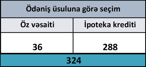 Ödəniş üsluna görə isə, mənzilin dəyərini 36 nəfər öz vəsaiti hesabına, 288 nəfər ipoteka krediti ilə ödəyəcək.
