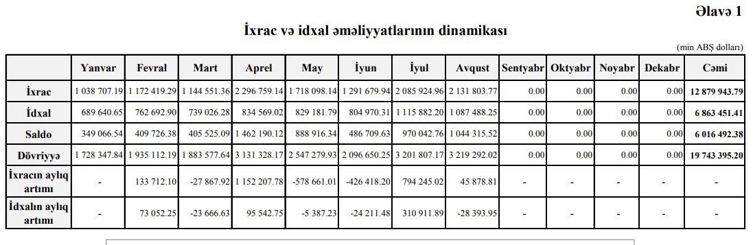 Avqustda ixrac 2 milyard 131 milyon 803 min dollar, idxal 1 milyard 87 milyon 488 min dollar, saldo isə müsbət 1 milyard 44 milyon 315 min dollar olub. Son iki ayda Azərbaycanın idxalı hər ay 1 milyard dollardan yüksək olub.