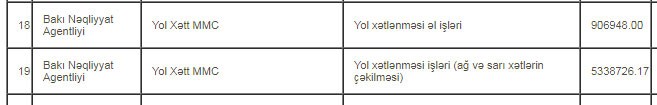 Nazirlər Kabineti yanında Bakı Nəqliyyat Agentliyi (BNA) "Yol Хətt" MMC ilə yol xətlənməsi üzrə işlərin görülməsi haqqında 6 milyon 245 min 674 manat dəyərində 2 müqavilə bağlayıb.