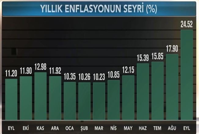 "Marja" xəbər verir ki, Türkiyədə Sentyabrda inflyasiya aylıq 6,3%, illik isə 24,52% təşkil edib. Bu proqnozlardan yüksəkdir. İnflyasiyanın aylıq 3,50%, illik isə 21,3% təşkil edəcəyi gözlənilirdi. İllik inflyasiya 2003-cü ilin İyun ayından bəri ən yüksək səviyyədir.