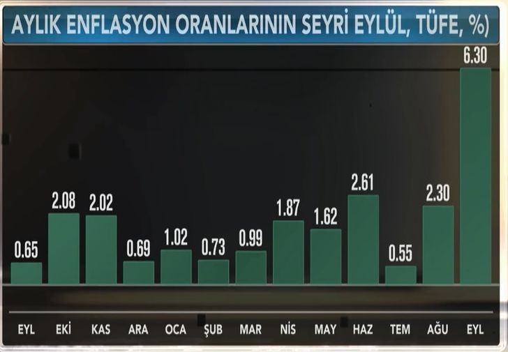 Türkiyə Statistika Komitəsi (TÜİK) tərəfindən verilən açıqlamaya görə, istehlakçı qiymətləri 2018-ci ilin Sentyabr ayında əvvəlki ayla müqayisədə 6,30 %, ötən ilin Dekabr ayı ilə müqayisədə 19,37%, ötən ilin Sentyabr ayı ilə müqayisədəisə 24,52% artıb.