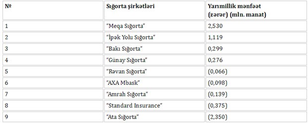 Qalan 9 sığorta şirkəti – “AXA Mbask”, “Amrah Sığorta”, “Ata Sığorta”, “Bakı Sığorta”, “Günay Sığorta”, “İpək Yolu Sığorta”, “Meqa Sığorta”, “Rəvan Sığorta” və “Standard Insurance” ASC-lər isə 2018-ci ilin yanvar-iyun aylarının yekunları barədə ictimaiyyəti məlumatlandırıb. Bunlardan 4-ü yarımili mənfəətlə, 5-i isə zərərlə başa vurub.