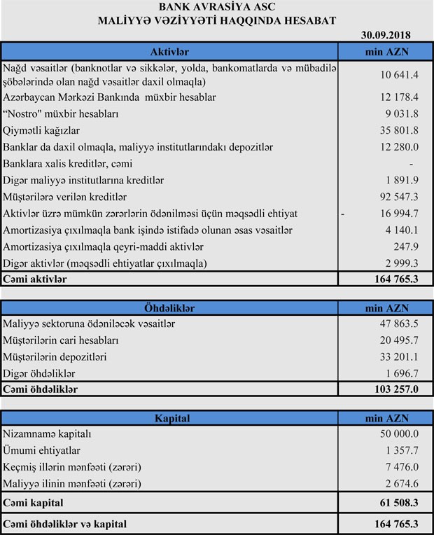 30 Sentyabr 2018-ci il tarixində "Bank Avrasiya" 153 milyon 355 min manat cəmi aktivlərə (o cümlədən 86 milyon 780 min manat müştərilərə verilən kreditlər və 24 milyon 380 min manat qiymətli kağızlara investisiya), 89 milyon 469.7 min manat cəmi öhdəliklərə və 63 milyon 886.1 min manat balans kapitalına malik idi.
