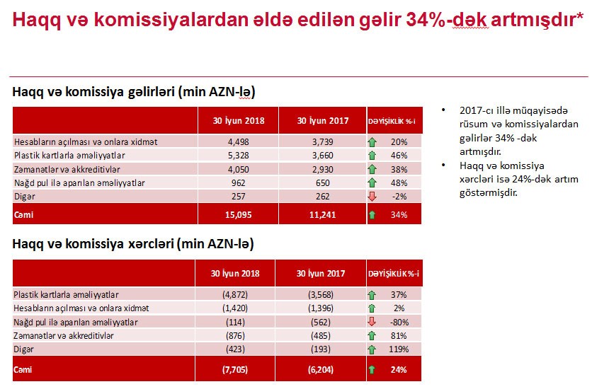 Bankın xalis mənfəəti 30 iyun 2018-ci il tarixinə bitən 6 ay üzrə 35 milyon 394 min AZN olmuşdur. Bu məbləğ keçən ilin ilk 6 ayında 50 milyon 324 min manat təşkil etmişdi. 30 İyun 2018-ci il tarixinə faiz gəlirləri 109 milyon 31 min AZN səviyyəsinə çatmışdır. 30 İyun 2017-ci il tarixinə bu məbləğ 132 milyon 453 min AZN olmuşdu.