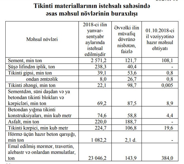 2018-ci ilin 9 ayı ərzində tikinti materiallarının istehsalı sahəsində fəaliyyət göstərən müəssisələr tərəfindən istehsal edilmiş məhsulun ümumi dəyəri 32,2 faiz artaraq 448,5 milyon manat təşkil etmişdir.