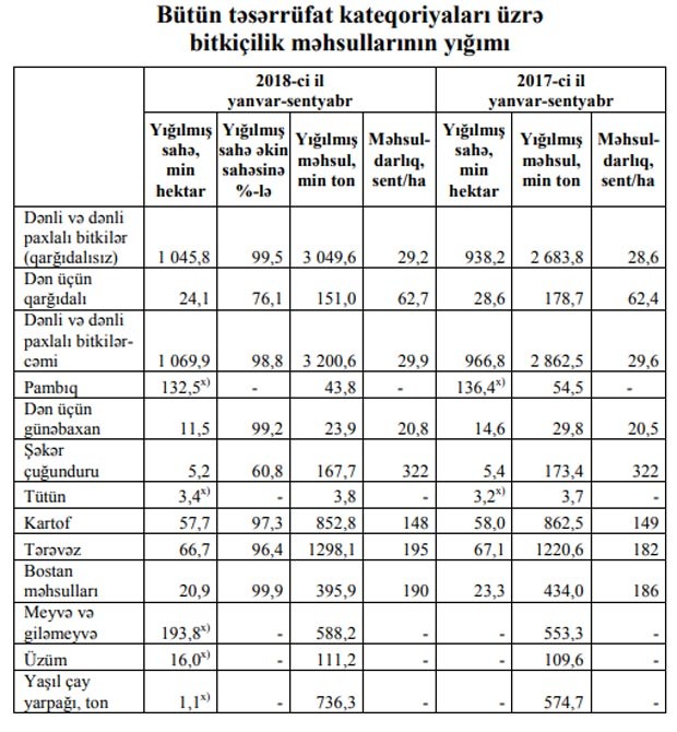 Hesabat dövrünə 588,2 min ton (6,3 faiz çox) meyvə və giləmeyvə, 111,2 min ton (1,4 faiz çox) üzüm ı toplanmışdır.