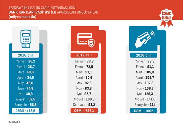 Eyni zamanda “İxrac İcmalı”nda məlumat verilib ki, 2018-ci ilin yanvar-sentyabr aylarında Azərbaycana dünyanın 193 ölkəsindən 2208,6 min və ya ötən ilin müvafiq dövrü ilə müqayisədə 6,4 faiz çox əcnəbi və vətəndaşlığı olmayan şəxs gəlib. 2018-ci ilin yanvar-sentyabr ayları ərzində Azərbaycana gələn xarici vətəndaşların bank kartları vasitəsi ilə apardıqları əməliyyatların dəyəri 1002 milyon manat təşkil edib və 2017-ci ilin müvafiq dövrü ilə müqayisədə bu əməliyyatların dəyəri 205 milyon AZN və ya 25 faiz artıb.