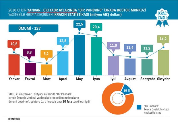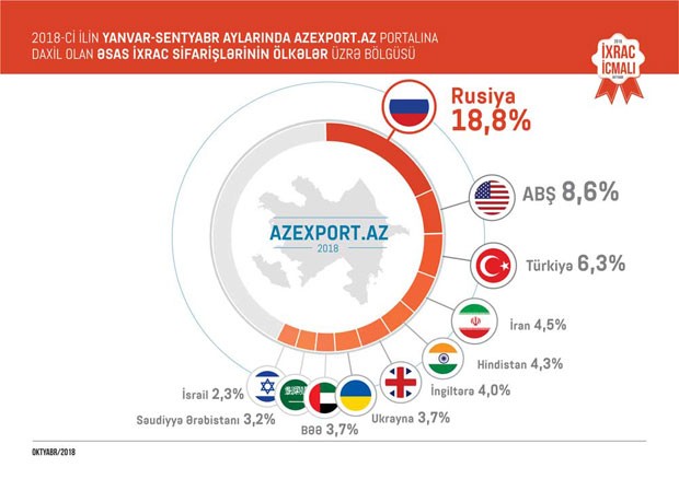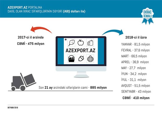 Məlumat üçün qeyd edək ki, 2017-ci ilin yanvar ayından 2018-ci ilin 30 sentyabr tarixinə kimi (21 ay ərzində) Azexport.az portalına dünyanın 106 ölkəsindən daxil olan ixrac sifarişlərinin dəyəri 885 milyon ABŞ dolları təşkil edib.