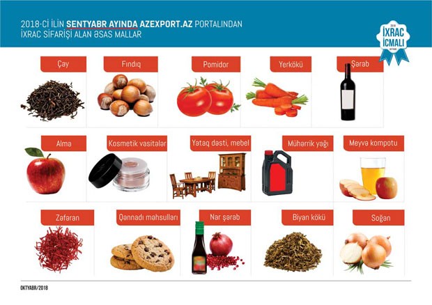 “İxrac İcmalı”nda 2018-ci ilin yanvar-sentyabr ayları ərzində Azexport.az portalına daxil olan ixrac sifarişləri barədə də məlumat verilib. Göstərilib ki, 2018-ci ilin sentyabr ayı ərzində Azexport.az portalına 43 milyon ABŞ dolları məbləğində ixrac sifarişləri daxil olub. Ümumilikdə isə 2018-ci ilin yanvar-sentyabr aylarında Azexport.az portalına daxil olan ixrac sifarişlərinin dəyəri 410 milyon ABŞ dolları təşkil edib. 2017-ci ilin müvafiq dövrü ilə müqayisədə 2018-ci ilin yanvar-sentyabr aylarında Azexport.az portalına daxil olan ixrac sifarişləri dəyər baxımından 15 faiz artıb.