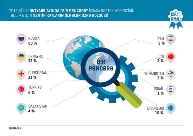 “İxrac İcmalı”nın sentyabr sayında “Bir Pəncərə” İxraca Dəstək Mərkəzinin fəaliyyəti barədə də məlumat verilib. Qeyd edilib ki, bu ilin oktyabr ayında “Bir Pəncərə” İxraca Dəstək Mərkəzi vasitəsi ilə həyata keçirdikləri ixracın dəyəri 13,2 milyon ABŞ dollarından çox olub. Hazırda ölkənin qeyri-neft ixracının 10 faizindən çoxunun sənədləşdirilməsi “Bir Pəncərə” İxraca Dəstək Mərkəzində həyata keçirilir.