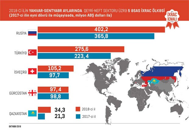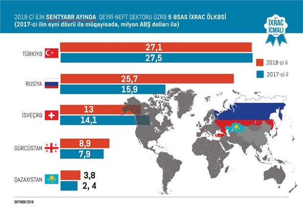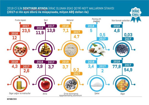 2018-ci ilin sentyabr ayında isə qeyri-neft sektoru üzrə ixrac 114 milyon ABŞ dolları təşkil edib və ən çox mal ixrac edilən ölkələrin siyahısına Rusiya (27 milyon ABŞ dolları) başçılıq edib. Daha sonra bu siyahıda Türkiyə (25,7 milyon ABŞ dolları), İsveçrə (13 milyon ABŞ dolları), Gürcüstan (8,9 milyon ABŞ dolları) və Qazaxıstan (3,8 milyon ABŞ dolları) qərarlaşıb. Sentyabr ayında qeyri-neft sektoru üzrə ixracda qabığı təmizlənmiş meşə fındığı (12 milyon ABŞ dolları) birinci, qızıl (11,9 milyon ABŞ dolları) ikinci, metanol (7,1 milyon ABŞ dolları) isə üçüncü olub.