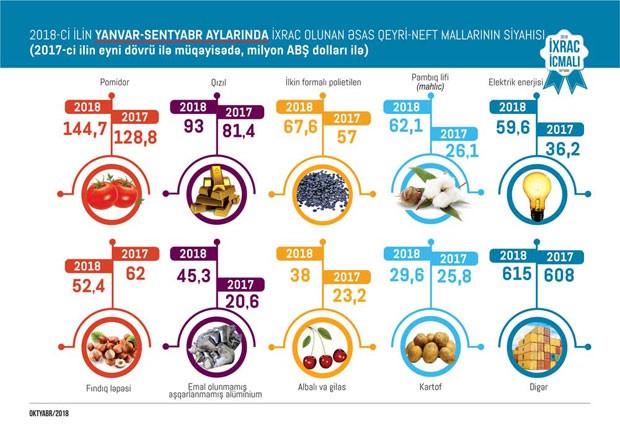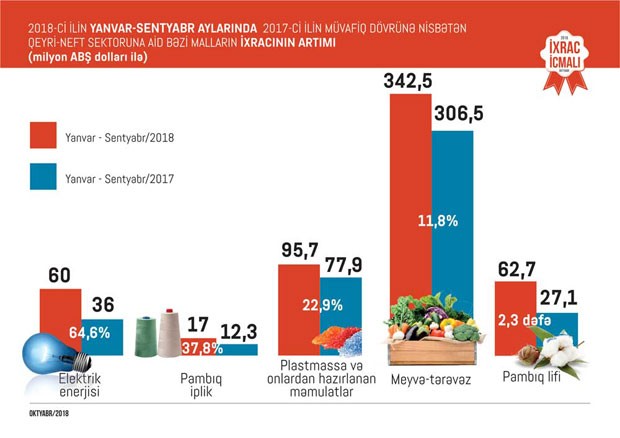 Ümumiyyətlə 2018-ci ilin yanvar- sentyabr ayları ərzində meyvə-tərəvəz ixracı 342,5 milyon, plastmassa və onlardan hazırlanan məmulatların ixracı 95,7 milyon, alüminium və ondan hazırlanan məmulatların ixracı 97,2 milyon, elektrik enerjisinin ixracı 60 milyon, qara metallar və onlardan hazırlanan məmulatların ixracı 64,3 milyon, pambıq lifi ixracı 62,7 milyon, kimya sənayesi məhsullarının ixracı 56,9 milyon, pambıq ipliyi ixracı 17 milyon ABŞ dolları təşkil edib.