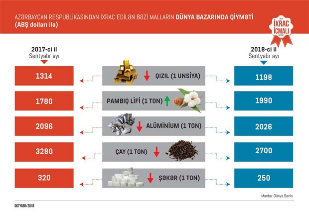 Qeyd edək ki, 2017-ci ilin müvafiq dövrü ilə müqayisədə 2018-ci ilin 9 ayında pambıq lifinin ixracı 2,3 dəfə, elektrik enerjisinin ixracı 64,6 faiz, pambıq ipliyinin ixracı 37,8 faiz, plastmassa və onlardan hazırlanan məmulatların ixracı 22,9 faiz, meyvə-tərəvəzin ixracı 11,8 faiz, alüminium və ondan hazırlanan məmulatların ixracı 11,2 faiz, qara metallar və onlardan hazırlanan məmulatların ixracı 5,5 faiz artıb.