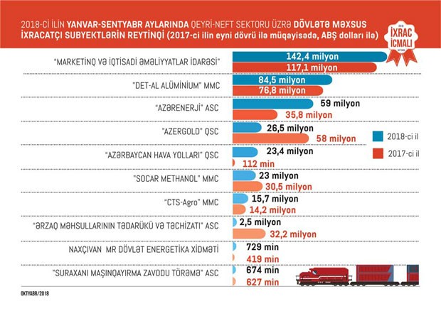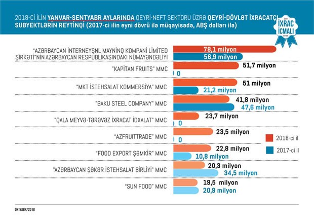 “İxrac İcmalı”nın sentyabr sayında qeyri-neft sektoru üzrə əsas ixracatçı subyektlərin reytinqi də verilib. 2018-ci ilin yanvar-sentyabr aylarında qeyri-neft sektoru üzrə qeyri-dövlət ixracatçı subyektlərin siyahısında “Azərbaycan İnterneyşnl Mayninq Kompani Limited Şirkəti”nin Azərbaycan Respublikasındakı nümayəndəliyi, "Kapitan Fruits" MMC, "MKT İstehsalat Kommersiya" MMC, "Baku Steel Company" MMC, "Qala meyvə-tərəvəz ixracat idxalat" MMC, “Azfruittrade” MMC, “Food Export Şəmkir” MMC, "Azərbaycan Şəkər İstehsalat Birliyi" MMC və “Sun Food” MMC önə çıxıb.