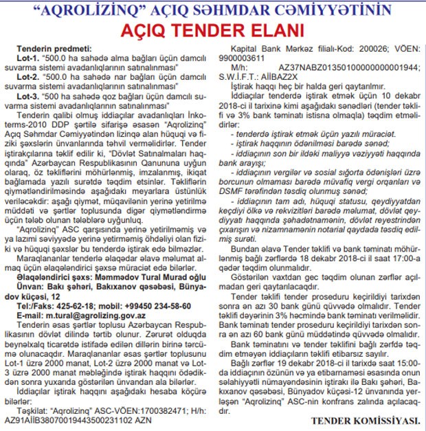 "Aqrolizinq" ASC 1500 hektar meyvə bağları üçün damcılı suvarma sistemi avadanlıqları satın alır.