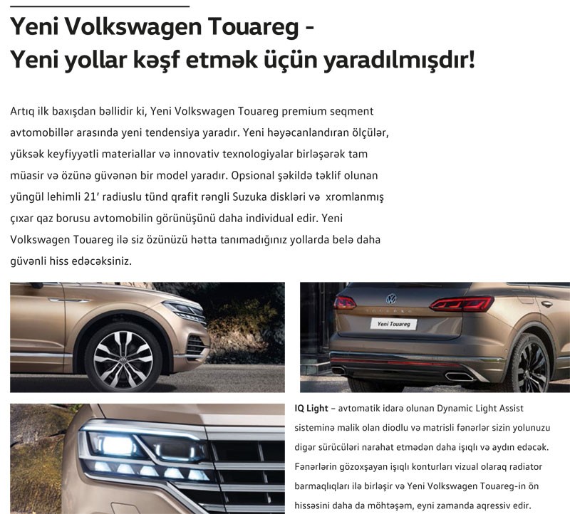 Yeni Touareg modelləri artıq noyabr ayında Azərbaycanda olacaq, ancaq ona sahib olmaq üçün gözləməyə ehtiyac yoxdur. Siz artıq bu gündən Volkswagen Bakı Mərkəzinə yaxınlaşaraq öz sifarişlərinizi edə bilərsiniz.
