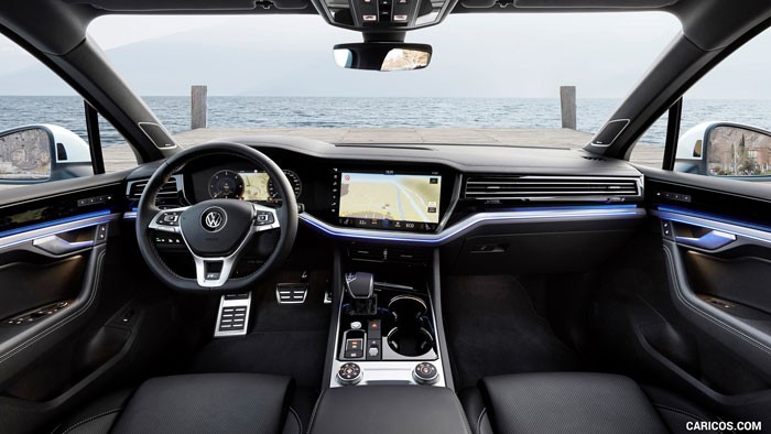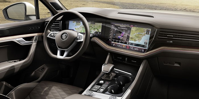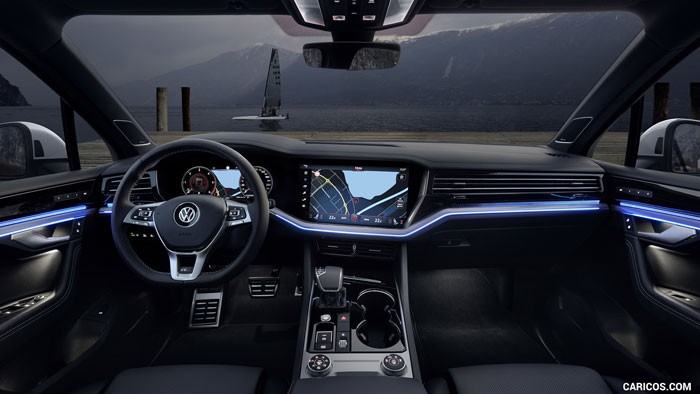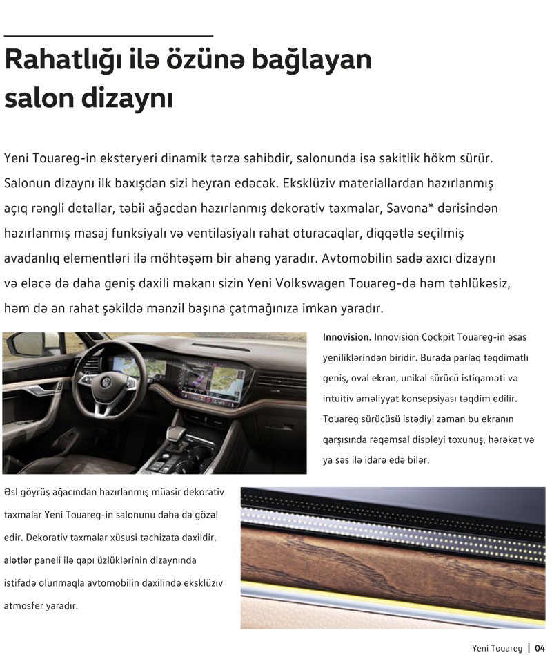 Salona daxil olduqda isə, buradan ayrılmaq istəməyəcəksiniz. 2 ədəd böyük ekran - 12 düyümlük (öz seqmentində maksimal ölçü) alətlər paneli və 15 düyümlük multimediya ekranı. Sürücü və sərnişinlərin rahatlığı və komfortu üçün bütün incəliklər düşünülüb, hətta öz Touareg avtomobilinizin interyerini zövqünüzə və ya geyiminizə uyğun rəngdə ışıqlandıra bilərsiniz. Yüksək alman keyfiyyəti özünü ən kiçik detallarda belə göstərir.