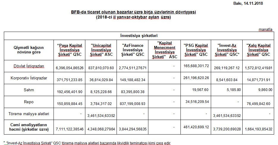 Birjadan "Marja"ya daxil olmuş məlumata görə, 2018-ci il yanvar-oktyabr aylarında 7 milyard 111 milyon manatlıq dövriyyə ilə “Paşa Kapital İnvestisiya Şirkəti" birinci yeri tutub.