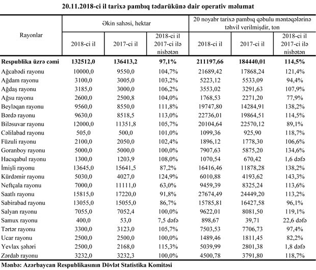 Pambıq tədarükünə dair noyabrın 20-nə olan operativ məlumatı təqdim edir.