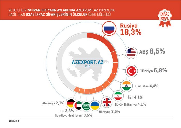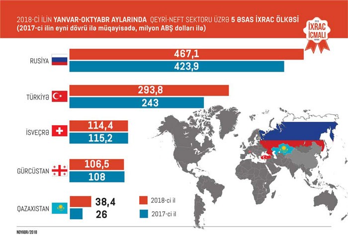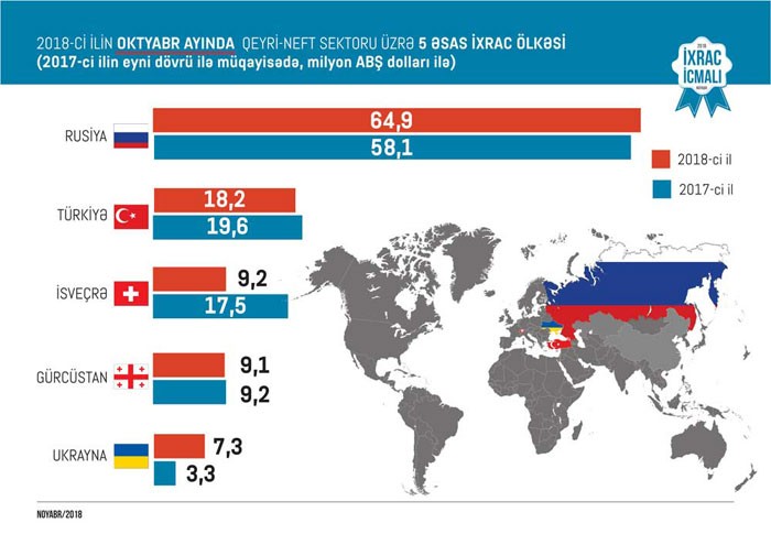 2018-ci ilin oktyabr ayında isə qeyri-neft sektoru üzrə ixrac 144 milyon ABŞ dolları təşkil edib. 2018-ci ilin oktyabr ayında qeyri-neft sektoruna aid ən çox mal ixrac edilən ölkələrin siyahısına Rusiya (64,9 milyon ABŞ dolları) başlıq edib. Daha sonra bu siyahıda Türkiyənin (18,2 milyon ABŞ dolları), İsveçrənin (9,2 milyon ABŞ dolları), Gürcüstanın (9,1 milyon ABŞ dolları), Ukraynanın (7,3 milyon ABŞ dolları) və digər ölkələrin adları var.