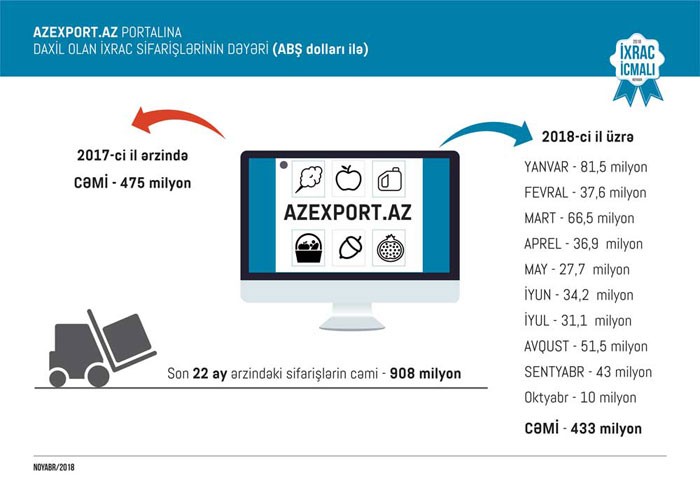 Azexport.az portalına 2018-ci ilin ilk 10 ayında 433 milyon ABŞ dolları məbləğində ixrac sifarişi daxil olub
