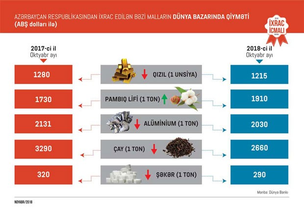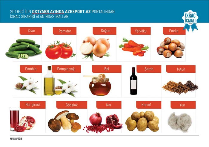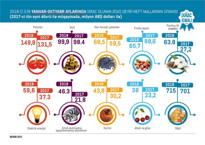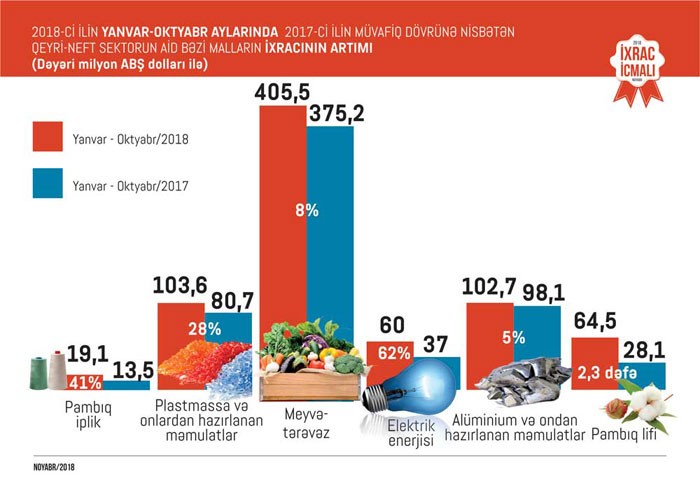 Ümumiyyətlə 2018-ci ilin yanvar-oktyabr ayları ərzində meyvə-tərəvəz ixracı 405,5 milyon, plastmassa və onlardan hazırlanan məmulatların ixracı 103,6 milyon, alüminium və ondan hazırlanan məmulatların ixracı 102,7 milyon, elektrik enerjisinin ixracı 60 milyon, qara metallar və onlardan hazırlanan məmulatların ixracı 72,2 milyon, pambıq lifi ixracı 64,5 milyon, kimya sənayesi məhsullarının ixracı 63,9 milyon, pambıq ipliyi ixracı 19 milyon ABŞ dolları təşkil edib. 2017-ci ilin müvafiq dövrü ilə müqayisədə 2018-ci ilin 10 ayında pambıq lifinin ixracı 2,3 dəfə, elektrik enerjisinin ixracı 62 faiz, pambıq ipliyinin ixracı 41 faiz, plastmassa və onlardan hazırlanan məmulatların ixracı 28 faiz, meyvə-tərəvəzin ixracı 8 faiz, alüminium və ondan hazırlanan məmulatların ixracı 5 faiz, qara metallar və onlardan hazırlanan məmulatların ixracı 5 faiz artıb.