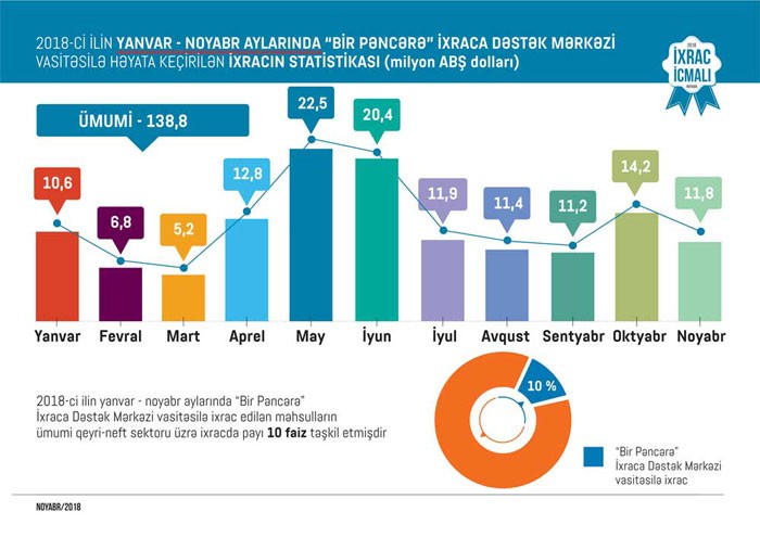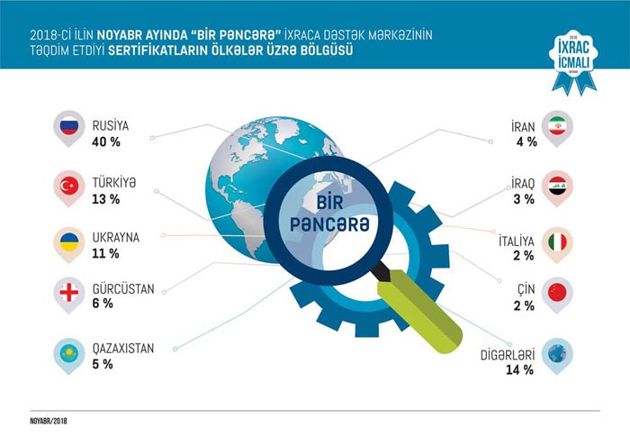 “İxrac İcmalı”nın noyabr sayında “Bir Pəncərə” İxraca Dəstək Mərkəzinin fəaliyyəti barədə də məlumat verilib. Qeyd edilib ki, bu ilin noyabr ayında “Bir Pəncərə” İxraca Dəstək Mərkəzi tərəfindən fiziki və hüquqi şəxslərə bir pəncərə prinsipi əsasında ixracla bağlı tələb olunan sertifikatlar verilib. “Bir Pəncərə” İxraca Dəstək Mərkəzi vasitəsi ilə həyata keçirdikləri ixracın dəyəri isə 11,8 milyon ABŞ dolları olub. Sertifikat verilən məhsullar Rusiya, Türkiyə, Ukrayna, Gürcüstan, Qazaxıstan, İsveçrə, İtaliya, İran, Polşa, Çin, Çex Respublikası, Estoniya, Almaniya, Moldova, İraq, Özbəkistan, Tacikistan, Koreya, İsrail və Malayziya daxil olmaqla dünyanın müxtəlif ölkələrinə ixrac olunub. Hazırda ölkənin qeyri-neft ixracının 10 faizinin sənədləşdirilməsi “Bir Pəncərə” İxraca Dəstək Mərkəzində həyata keçirilir.