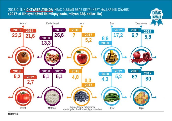 Bu ilin oktyabr ayında qeyri-neft sektoru üzrə ixracda xurma (23,4 milyon ABŞ dolları) birinciliyi ələ alıb. Qabığı təmizlənmiş meşə fındığı (13,3 milyon ABŞ dolları) ilə alma (7 milyon ABŞ dolları) isə ikinci və üçüncü yeri bölüşüblər.