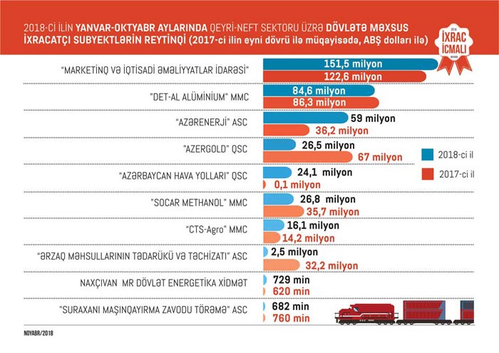 “İxrac İcmalı”nın noyabr sayında qeyri-neft sektoru üzrə əsas ixracatçı subyektlərin reytinqi də verilib. 2018-ci ilin yanvar-oktyabr aylarında qeyri-neft sektoru üzrə qeyri-dövlət ixracatçı şirkətlərin siyahısında ilk onluqda “Azərbaycan İnterneyşnl Mayninq Kompani Limited Şirkəti”nin Azərbaycan Respublikasındakı nümayəndəliyi, "MKT İstehsalat Kommersiya" MMC, "Kapitan Fruits" MMC, "Baku Steel Company" MMC, “Azfruittrade” MMC, “Food Export Şəmkir” MMC, "Qala meyvə-tərəvəz ixracat idxalat" MMC, “Sun Food” MMC, "Azərbaycan Şəkər İstehsalat Birliyi" MMC, "Ram Beynəlxalq Nəqliyyat və Ticarət Ltd" MMC təmsil olunub.