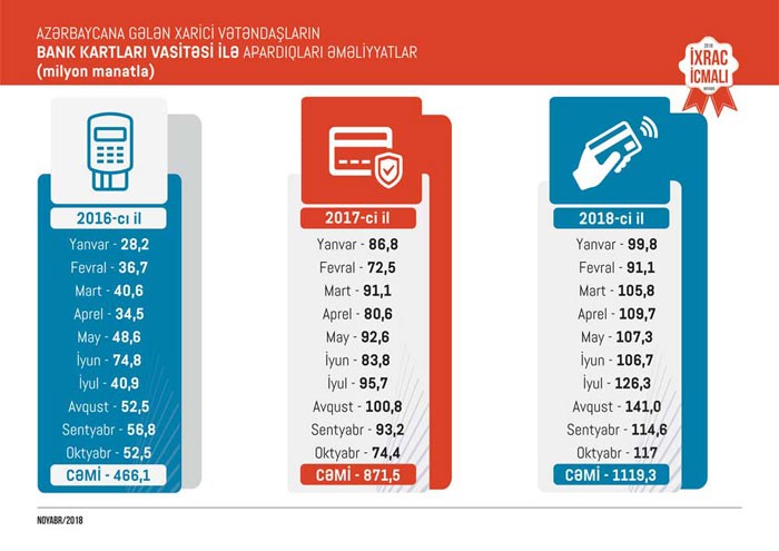 Eyni zamanda “İxrac İcmalı”nda məlumat verilib ki, 2018-ci ilin yanvar-oktyabr ayları ərzində Azərbaycana dünyanın 194 ölkəsindən 2420,4 min və ya ötən ilin müvafiq dövrü ilə müqayisədə 6,1 faiz çox əcnəbi və vətəndaşlığı olmayan şəxs gəlib. Dövlət Sərhəd Xidmətinin məlumatına əsasən gələnlərin 31,1 faizi Rusiya Federasiyası, 20,2 faizi Gürcüstan, 10,1 faizi Türkiyə, 8,9 faizi İran, 3,2 faizi Birləşmiş Ərəb Əmirlikləri, 2,8 faizi Səudiyyə Ərəbistanı, 2,6 faizi İraq, 2,0 faizi Ukrayna, 1,6 faizi İsrail, 17,4 faizi digər ölkələrin vətəndaşları, 0,1 faizi isə vətəndaşlığı olmayan şəxslər olub. 2018-ci ildə ölkəmizə gələn xarici vətəndaşların bank kartları vasitəsi ilə xərcləmələrində isə artım müşahidə edilib. Belə ki, 2018-ci ilin yanvar-oktyabr ayları ərzində Azərbaycana gələn xarici vətəndaşların bank kartları vasitəsi ilə apardıqları əməliyyatların dəyəri 1119 milyon manat təşkil edib. 2017-ci ilin müvafiq dövrü ilə müqayisədə 2018-ci ilin yanvar-oktyabr ayları ərzində Azərbaycana gələn xarici vətəndaşların bank kartları vasitəsi ilə apardıqları əməliyyatların dəyəri 248 milyon manat və ya 28 faiz artıb.