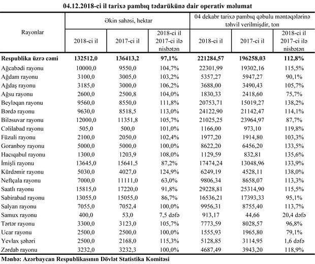 Xatırladaq ki, 2018-ci ildə ölkəmizdə 132 min 512 hektar sahədə pambıq əkilib. Pambıq tədarükündəki artım məhsuldarlığın yüksəldilməsi hesabına təmin olunub. Hazırda emal müəssisələrinə təhvil verilmiş pambığın hər kiloqramına görə dövlət tərəfindən fermerlərə 10 qəpik subsidiya verilir. Həmçinin bu il pambığın növlər üzrə mövcud alış qiymətləri hər ton üçün 50 manat olmaqla, 1-ci növün qiyməti 600-dən 650 manata, 2-ci növün qiyməti 580-dən 630 manata, 3-cü növün qiyməti 540-dan 590 manata, 4-cü növün qiyməti isə 500-dən 550 manata qədər artırılıb.