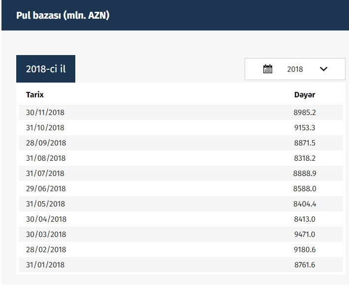 30.11.2018-ci il tarixinə pul bazası 8 milyard 985.2 milyon manat təşkil edib.