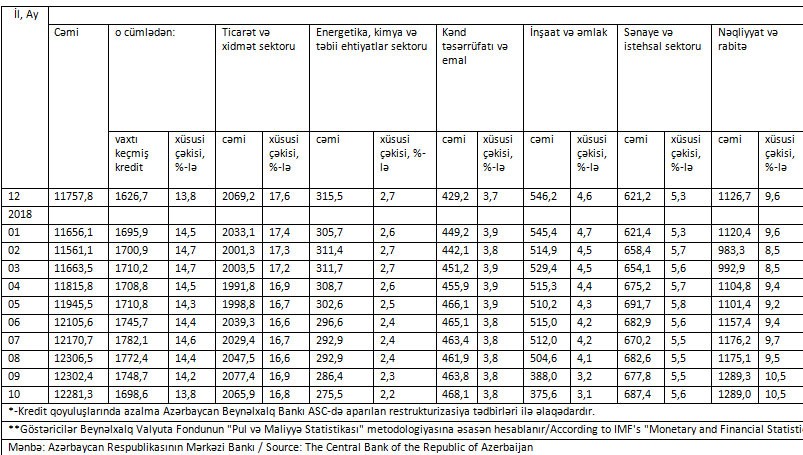 2018-ci ilin 10 ayı ərzində cəmi kredit qoyuluşlarının 524 milyon manat artmasına ən böyük töhfəni istehlak kreditləri verib. Yanvar-Oktyabr dövründə ev təsərrüfatlarına verilmiş kreditlər 500 milyon manat artaraq ötən ilin sonundakı 4 milyard 606 milyon manatdan 5 milyard 106 milyon manata qalxıb.