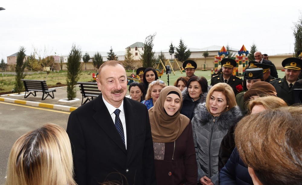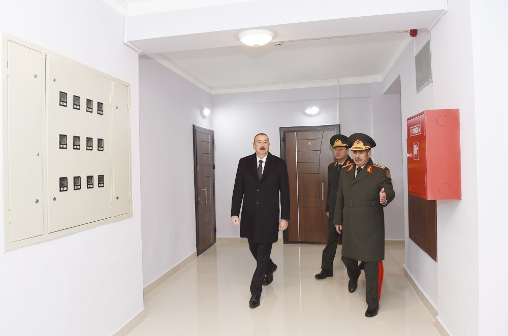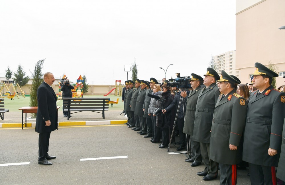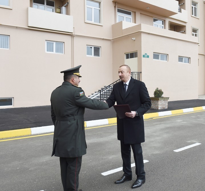 Bu gün hərbçilərin həyatında çox əlamətdar bir gündür. Bu gözəl binada 394 hərbçi ailəsinə dövlət tərəfindən mənzillər verilir. Mən sizi bu münasibətlə ürəkdən təbrik edirəm, sizə uğurlar arzulayıram. Arzu edirəm ki, bu gözəl binada rahat yaşayasınız.