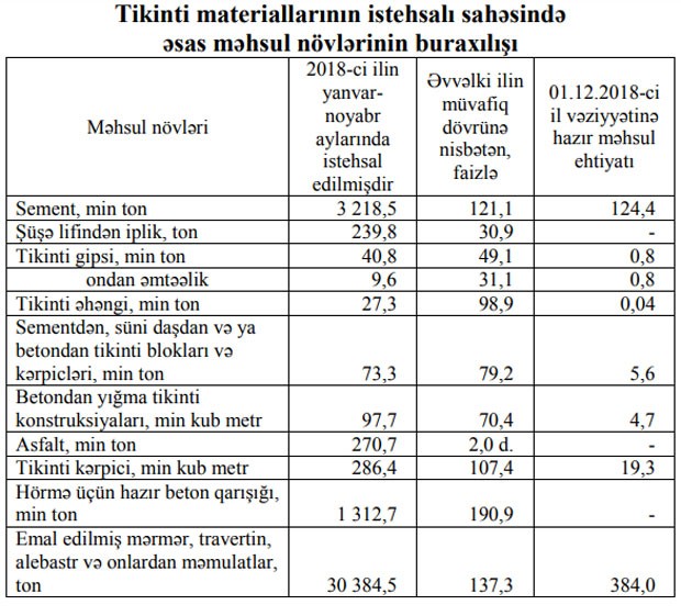 “Marja” Dövlət Statistika Komitəsinin aylıq hesabatına istinadən xəbər verir ki, hörmə üçün hazır beton qarışığının istehsalı 90,9 faiz, sementin istehsalı 21,1 faiz, tikinti kərpicinin istehsalı 7,4 faiz artmış, tikinti əhənginin istehsalı 1,1 faiz, betondan yığma tikinti konstruksiyalarının istehsalı 29,6 faiz, tikinti gipsinin istehsalı 50,9 faiz azalmışdır.