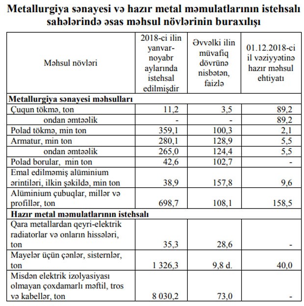 Yanvar-noyabr ayları ərzində sahə üzrə 280,1 min ton (28,9 faiz çox) armatur, 698,7 ton (8,1 faiz çox) alüminium çubuqlar, millər və profillər, 1 326,3 ton (9,8 dəfə çox) mayelər üçün çənlər, sisternlər istehsal edilmişdir.