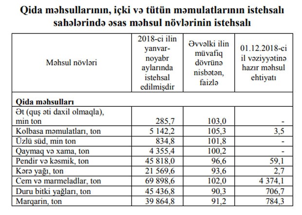 Əvvəlki ilin yanvar-noyabr ayları ilə müqayisədə tütün məmulatlarının istehsalında 2,2 dəfə, içki istehsalında 8,3 faiz, qida məhsullarının istehsalında isə 1,0 faiz artım müşahidə olunmuşdur.