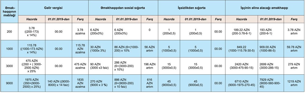 Cədvəldən göründüyü kimi, əməkhaqqı fondundan tutulan cəmi sosial ayırma bütün hallarda 25 ((22+3) və ya (10+15)) faiz olacaq. Əməkhaqqından tutulan gəlir vergisi və sosial sığorta ödənişləri ilə bağlı dəyişikliklərin işçilərin əldə etdiyi real gəlirlərinə təsirinin izahını aşağıda verilmiş cədvəldəki misallarla təqdim edirik.