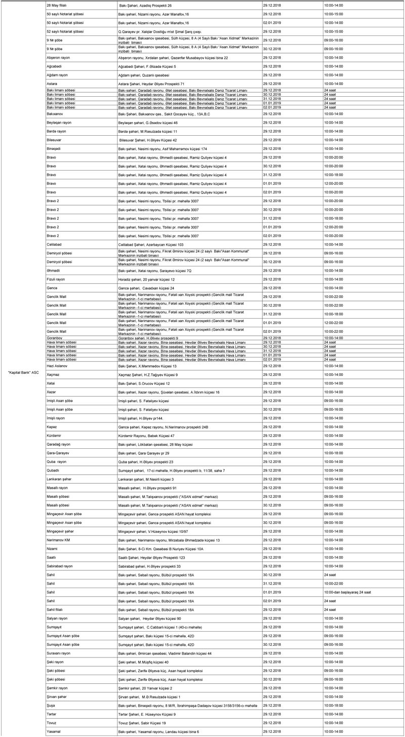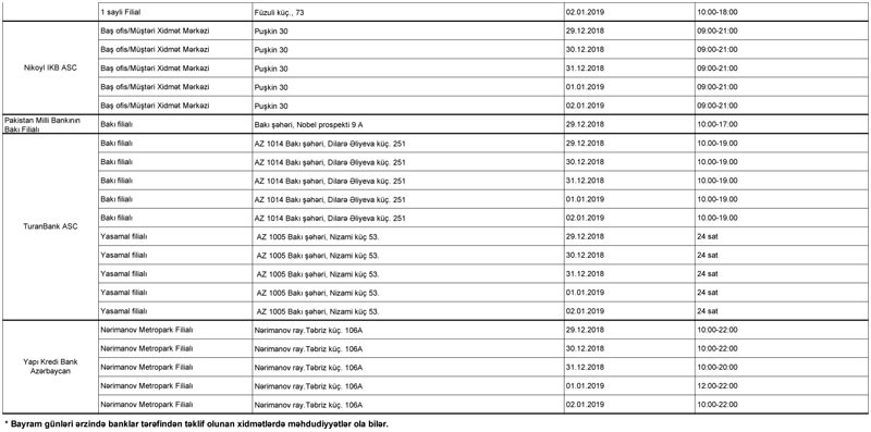 Bayram günlərində ölkəmizdə səfərdə olan turistlərin və ölkə vətəndaşlarının valyuta mübadiləsi xidmətlərinə rahat çıxış imkanlarının təmin edilməsi məqsədilə ümumilikdə 23 bankın 118 filial və şöbəsi (9 bank üzrə 12 satış nöqtəsi 24 saat rejimində olmaqla) 29 Dekabr – 02 Yanvar tarixlərində müştərilərə xidmət göstərəcək.