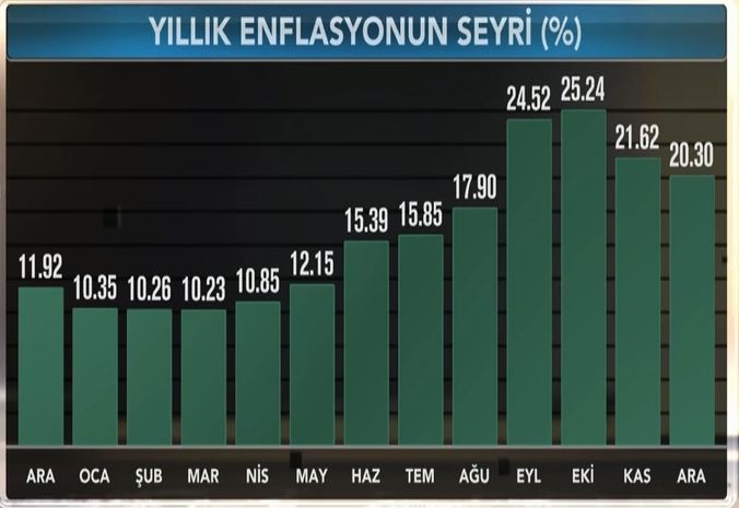 Türkiyə Statistika Komitəsinin (TÜİK) məlumatlarına görə, ölkədə istehlakçı qiymətləri indeksi Dekabrda aylıq müqayisədə 0.40% düşüb (deflyasiya), illik müqayisədə isə 20.30% artıb.