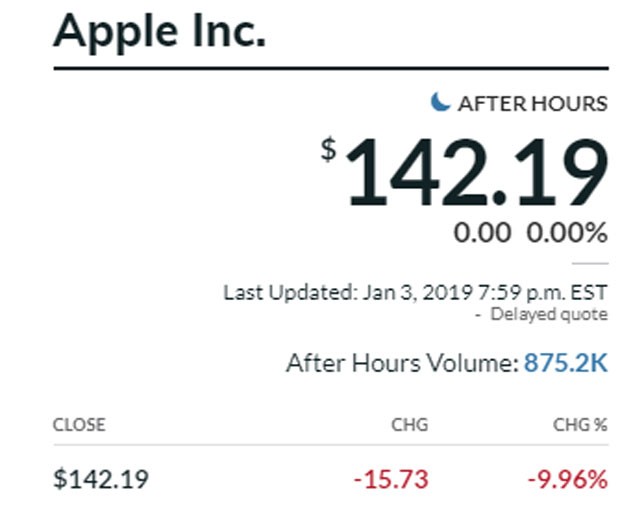 Apple-ın səhmləri, şirkətin 2019-cu ilin ilk rübü üçün satış gəliri gözləntisini, daha əvvəl açıqlanan 89 - 93 milyard dollar aralığından 84 milyard dollara salması ilə əlaqədar olaraq təxminən 10 faiz ucuzlaşıb. Şirkətin açıqlamasına görə, 10%-lik ucuzlaşma 50 milyard dollardan artıq dəyər itkisinə qarşılıqdır.