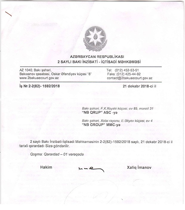 Qeyd edək ki, adları çəkilən şəxslərin müraciətə əlavə etdikləri sənədlərdən aydın olur ki, idxal etdikləri mal “NB GROUP” MMC tərəfindən ölkəyə gətirilib. Müraciətlərində şirkətlərini “rəsmi qeydiyyatdan keçmiş və Azərbaycan qanunvericiliyinə uyğun fəaliyyət göstərən şirkətlərdən biri” kimi təqdim etsələr də, 2 saylı Bakı İnzibati-İqtisadi Məhkəməsinin “NB GROUP” MMC-yə ünvanlandığı 21 dekabr 2018-ci tarixində keçirilən məhkəmə iclasının Qərardadında yazılanlar sahibkarların dediyi ilə üst-üstə düşmür.