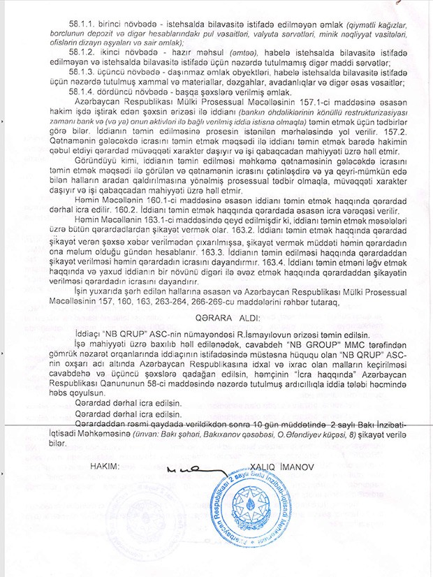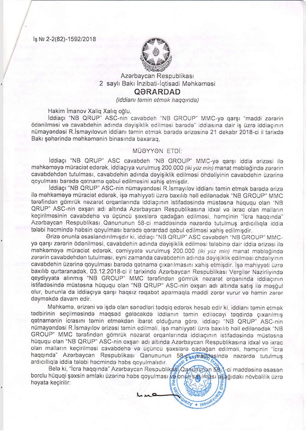 Həmin iddia ərizəsi əsasında 2 saylı Bakı İnzibati-İqtisadi Məhkəməsinin çıxardığı Qərardadda qeyd edilir ki, cavabdeh “NB GROUP” MMC tərəfindən gömrük nəzarəti orqanlarında iddiaçının istifadəsində müstəsna hüququ olan “NB GROUP” ASC-nin oxşarı adı altında Azərbaycan Respublikasına idxal və ixrac olan malların keçirilməsi cavabdehə və üçüncü şəxslərə qadağan edilsin, həmçinin “İcra haqqında” Azərbaycan Respublikasının Qanununun 58-ci maddəsində nəzərdə tutulmuş ardıcıllıqla iddia tələbi həcmində həbs qoyulsun.