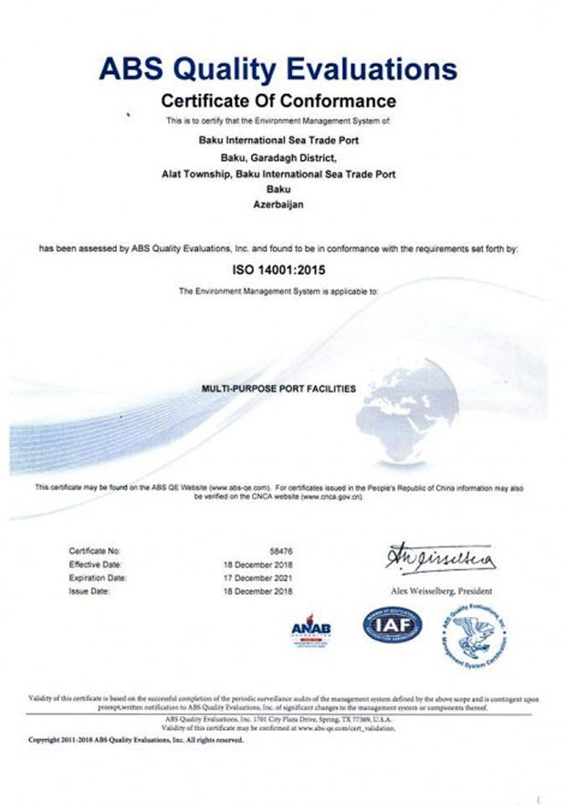 “Bakı Beynəlxalq Dəniz Ticarət Limanı” QSC-dən bildirilib ki, yeni Bakı Limanı beynəlxalq İSO 14001:2015 sertifikatlaşdırma auditini müvəffəqiyyətlə keçib. İSO 14001:2015 “Ətraf mühitin idarəetmə sistemi” üçün göstəriciləri müəyyən edir və bu standart üzrə sertifikatlaşdırma həyata keçirir. Sertifikatlaşdırma Bakı Limanının İSO 14001:2005 standartının ekoloji tələblərinə uyğun olaraq fəaliyyət göstərdiyini təsdiq edir. Bu sertifikat ən çox tanınmış və qəbul edilmiş ətraf mühit menecment standartıdır.