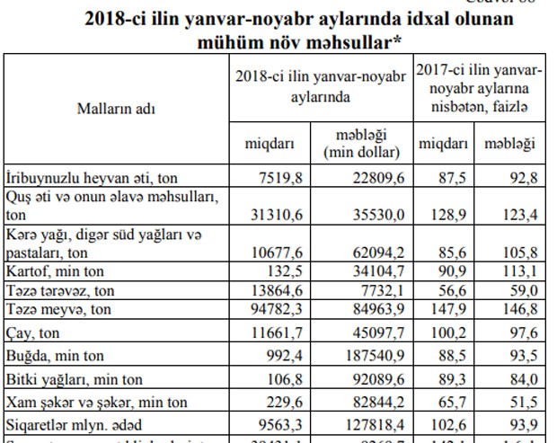2017-ci illə müqayisədə 2018-ci ilin yanvar-noyabr aylarında quş əti və onun əlavə məhsullarının idxalı 28,9% artaraq 31 min 310,6 ton təşkil edib. İdxala 35 milyon 530 min dollar xərclənib (23,4% artıb).