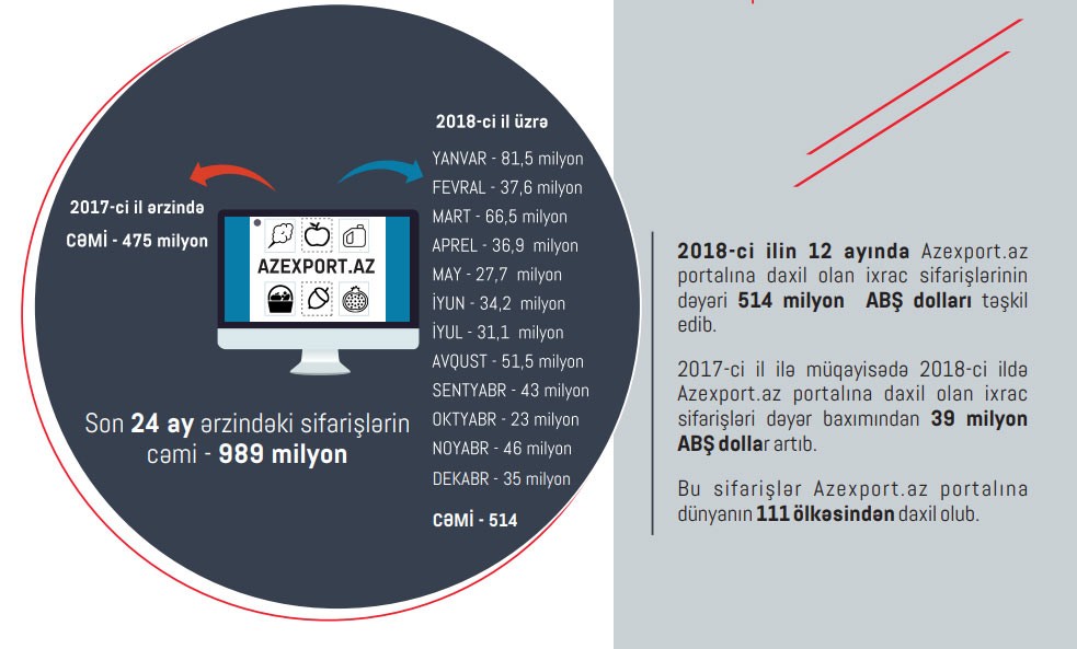 “Marja” “Azexport” portalının xüsusi buraxılışına istinadən xəbər verir ki, 2017-ci il ilə müqayisədə 2018-ci ildə Azexport.az portalına daxil olan ixrac sifarişləri dəyər baxımından 39 milyon ABŞ dollar artıb. Bu sifarişlər Azexport.az portalına dünyanın 111 ölkəsindən daxil olub.